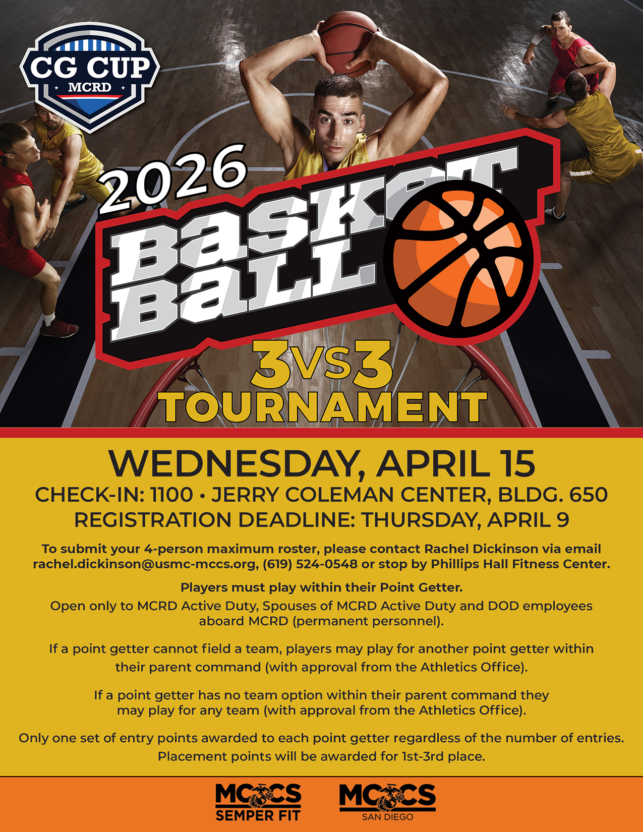 Please email rachel.dickinson@usmc-mccs.org, call (619) 524-0548 or stop by Phillips Hall Fitness Center to see her. Rosters must include all players rank, first/last name, section and phone number.